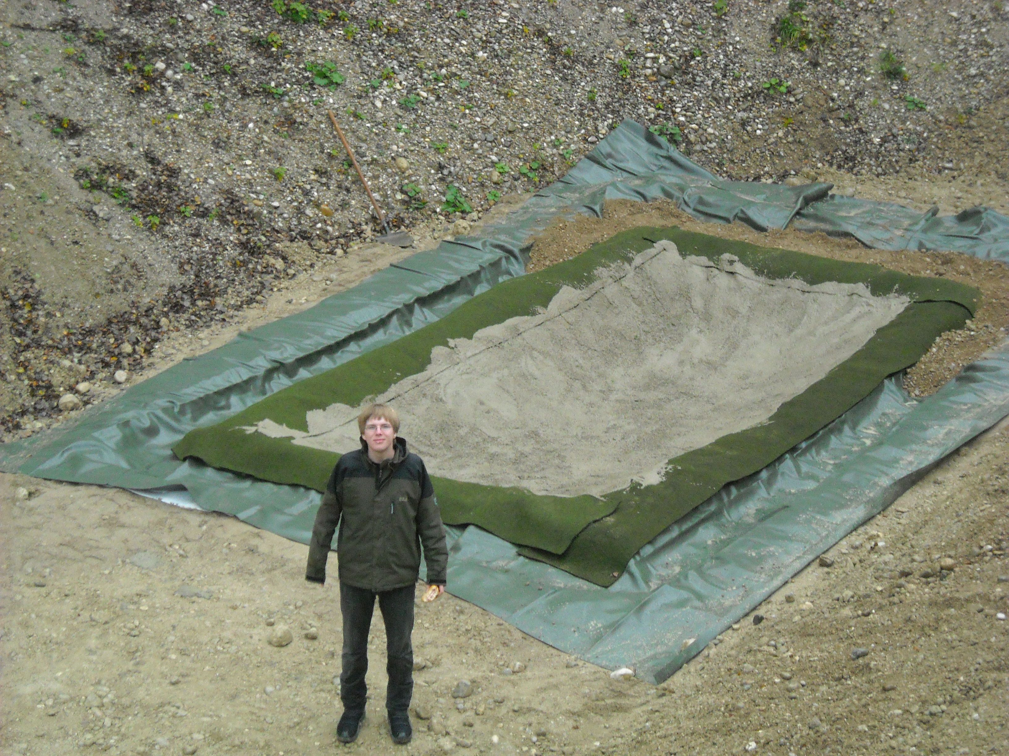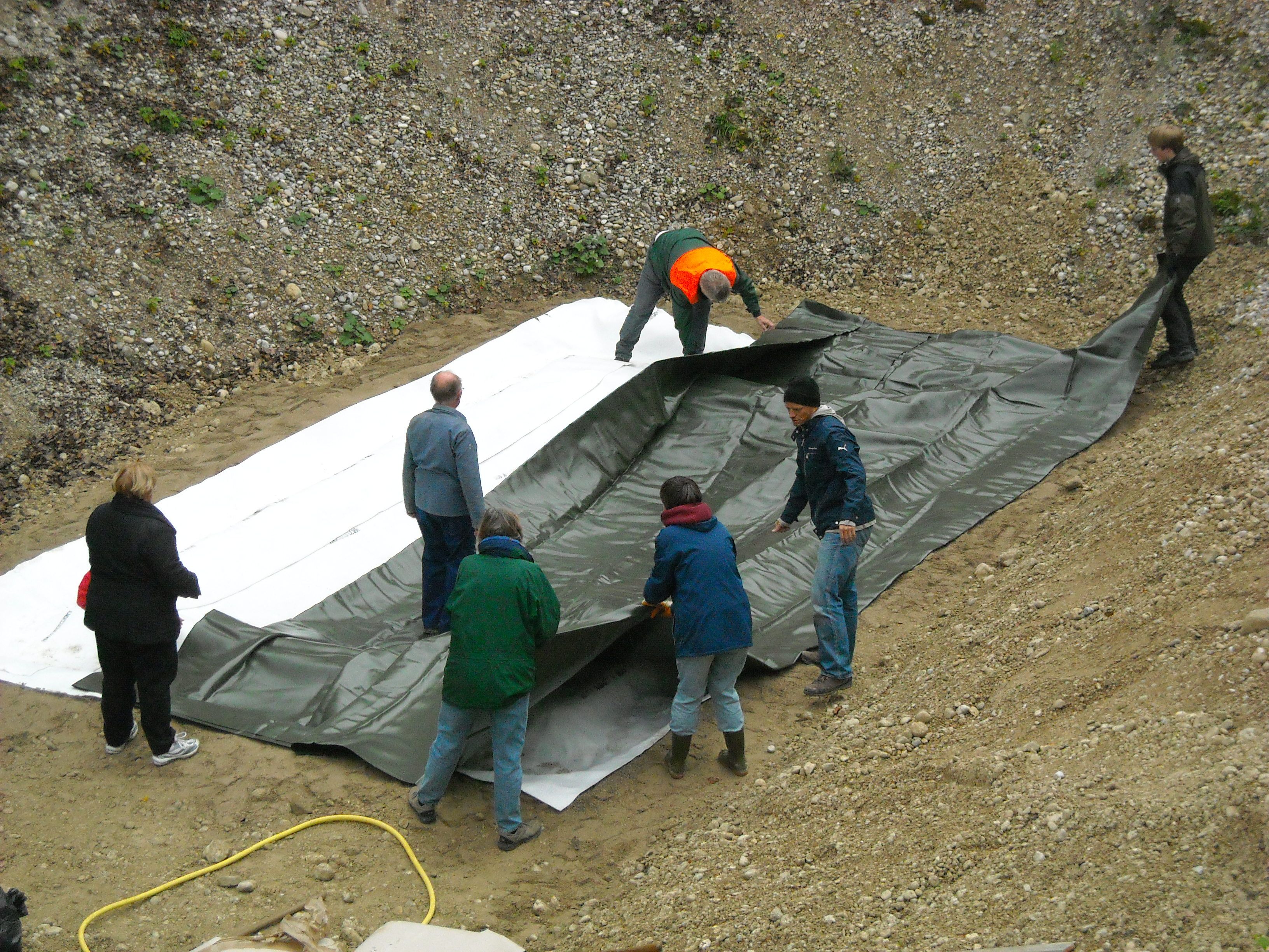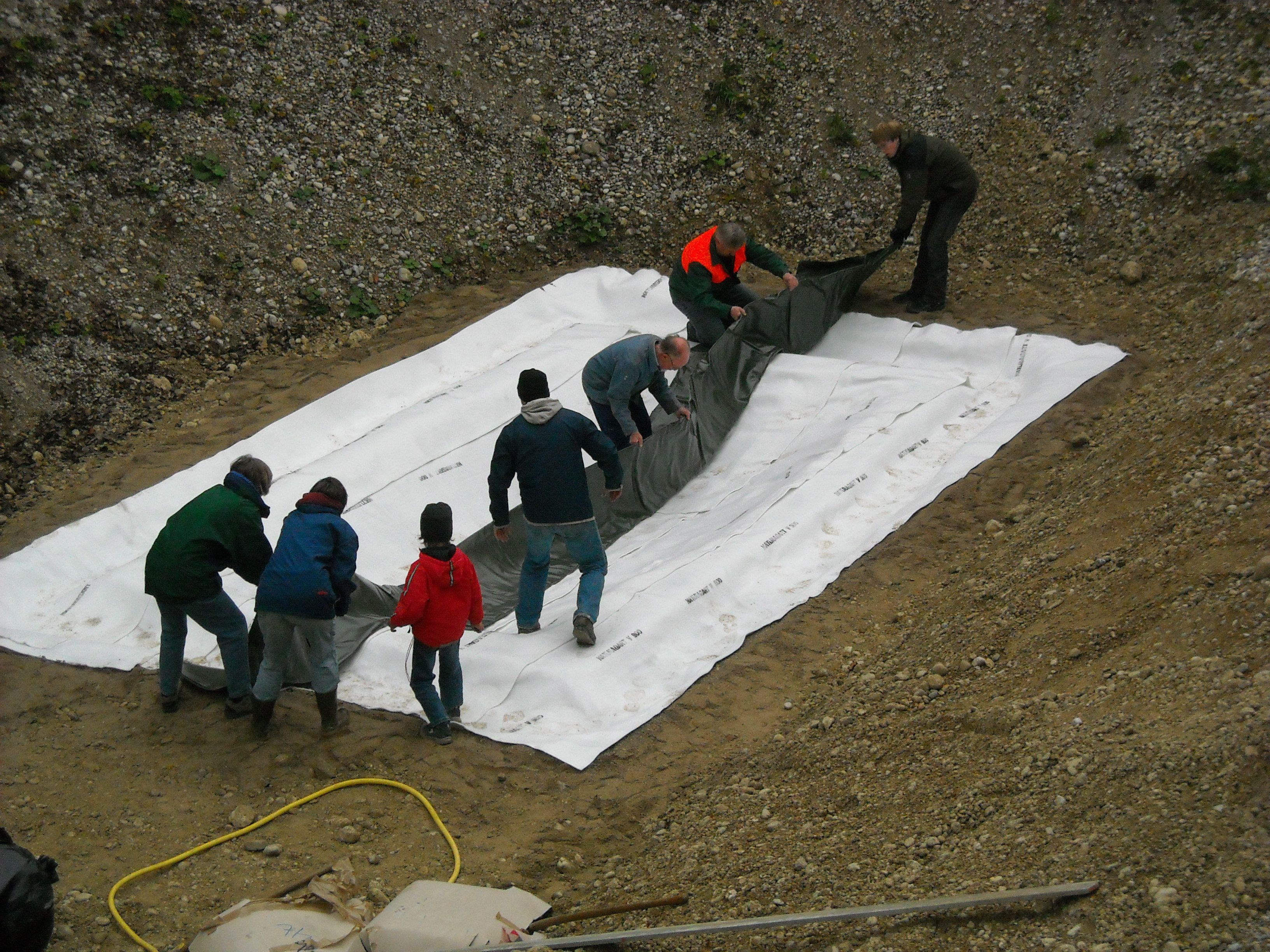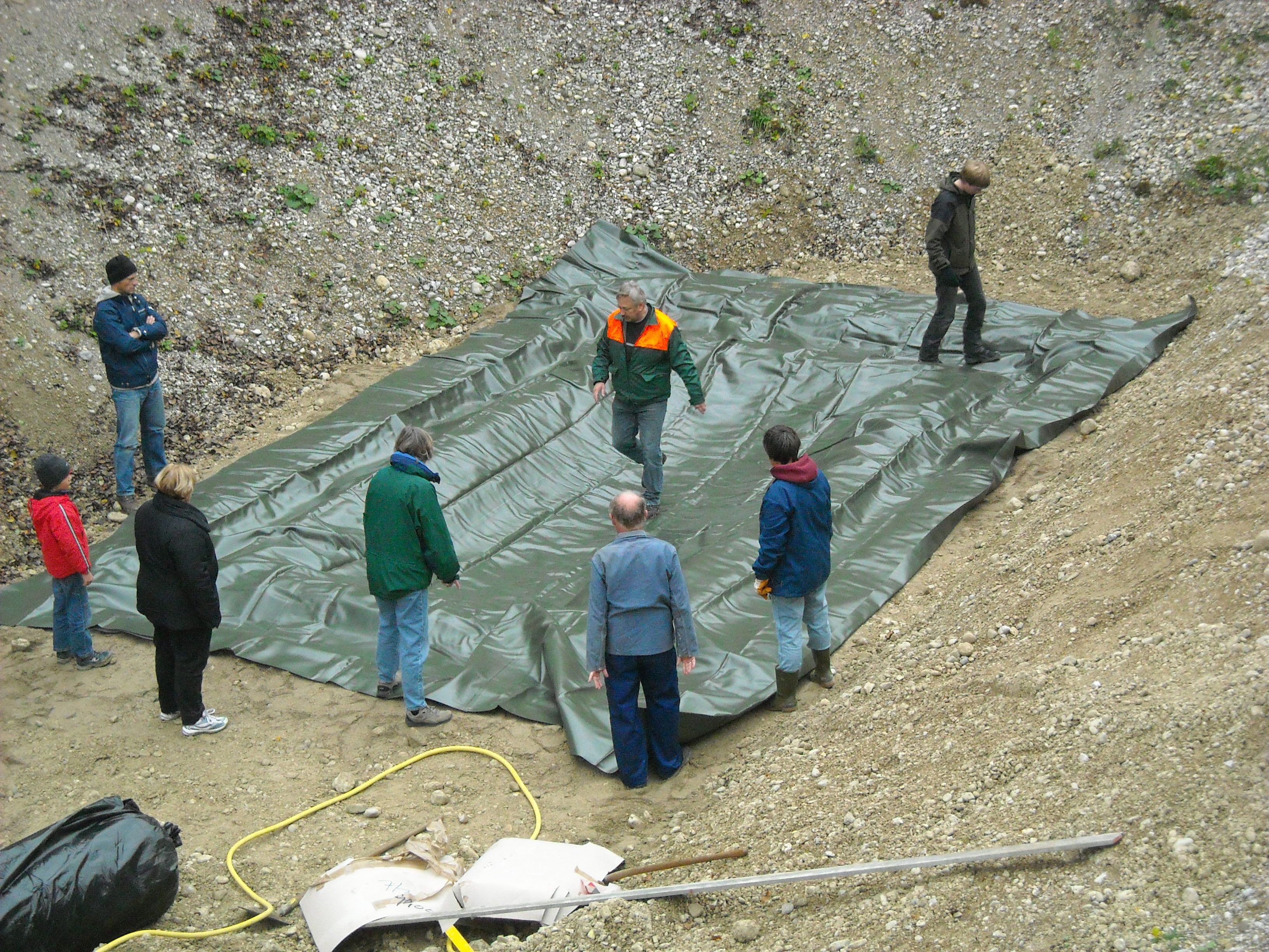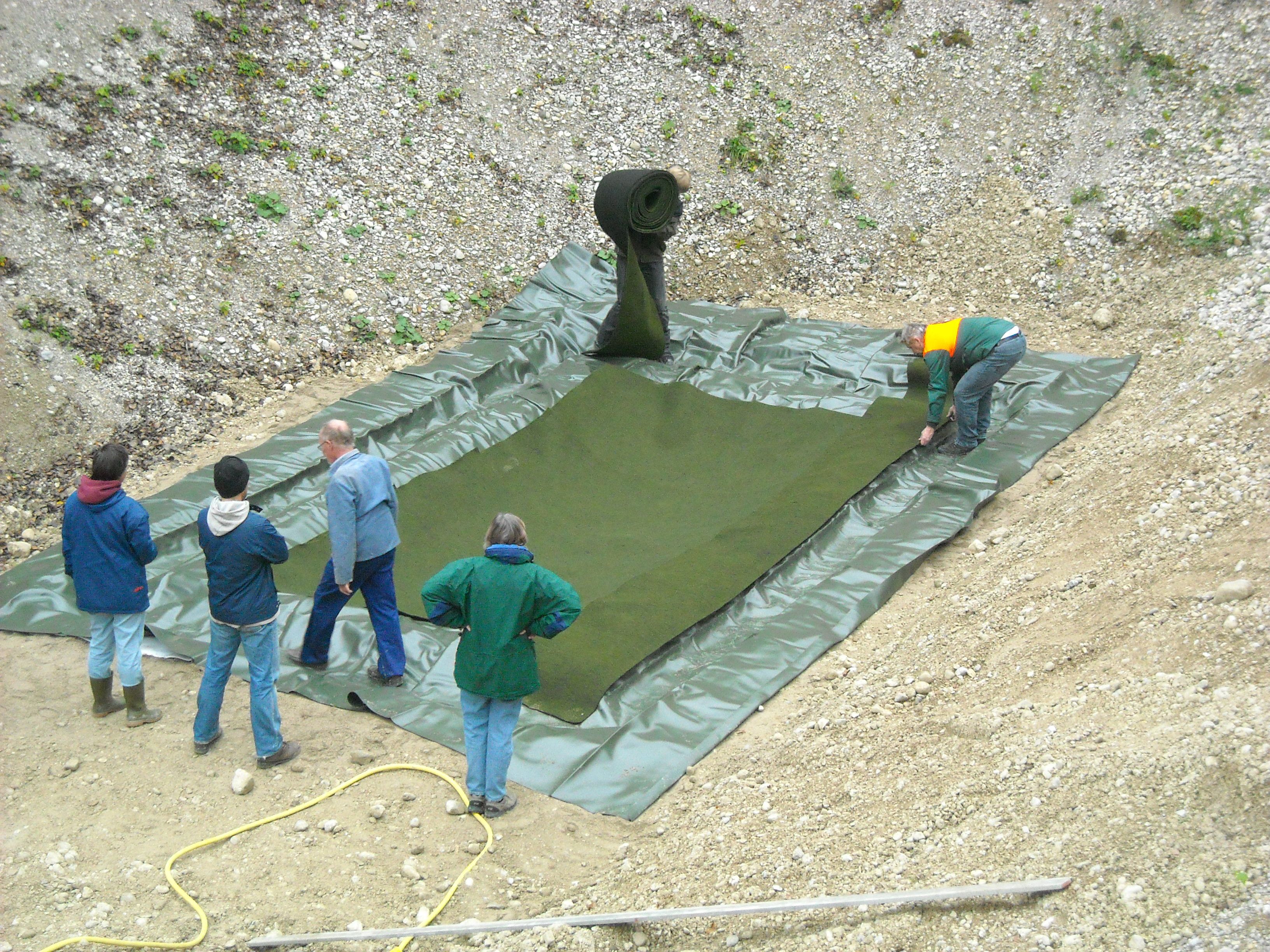 In der Mühlwegkiesgrube gibt es ein weiteres Laichgewässer, mit Teichfolie und Jute ausgelegt. Es liegt an einem Südhang, d.h. es ist sehr sonnig und warm, im Gegensatz zum großen Laichgewässer am Kiesgrubenboden. Wenn unten noch Eis ist, fühlt es sich oben schon sehr warm und sommerlich an. Wir hoffen, dass das Laichgewässer von Fröschen und Kröten angenommen wird. Gelbbauchunken bevorzugen frische, offene und lehmige Pfützen, d.h. sie werden es voraussichtlich nicht lieben. Aber wir können leider nicht jedes Jahr die Erde neu aufreißen...